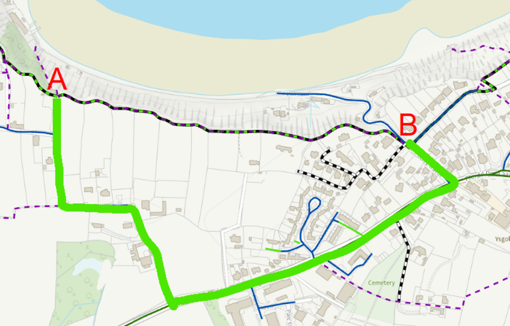 The diversion at St Asaph Avenue is until 31 January 2026. From 1 August to 31 October 2025, the 20 to 30 metre section of the Wales Coast Path will be reopened temporarily for two months. From October 2025, the diversion will be re-instated until the works are completed in early 2026. View St Asaph Avenue Kinmel Bay diversion map (updated 29 July 2025)